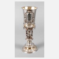 Wiener Silberpunze Dianakopf mit Buchstabe A, unleserliche Meistermarke, Silber partiell vergoldet, reich verziert mit Palmetten und Tiermotiven, am Schaft drei vollplastische Hasen, an der Kuppa drei Hundeköpfe, applizierte Kartusche mit Gravur in Ungarisch, normale Gebrauchs- und Altersspuren, H 31,5 cm, G ca. 868 g.