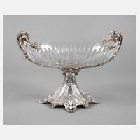 um 1900, Deckel unleserlich gepunzt, wohl Czechoslowakei, verziert mit Lorbeerlaub, Korpus aus fein geschliffenem Kristallglas, Tablett wohl England, gestempelt ”Sterling 54160”, ... ”patented dec. 23.1919”, dieses etwas gedellt, D 23 cm, G der beiden Silberteile ca. 299 g.
