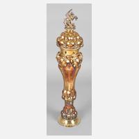 München, Ende 19. Jh., gestempelt Hofjuwelier Karl Weishaupt, gestempelt 900, Halbmond, Krone und Weishaupt, Silber innen und außen vergoldet, Buckelpokal mit aufgesetzten Türkisen bzw. Amethysten, umlaufende Ornamentbänder, auf dem Deckel die vollplastische Darstellung, Georg mit dem Drachen kämpfend, gute Erhaltung, H 67 cm, G ca. 2195 g.