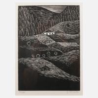 ?ppig bewachsener H?gel mit verstecktem Haus im Gegenlicht der untergehenden Sonne, Tuschelithografie, unter der Darstellung handsigniert und datiert ?K. Matth?i (19)77g, betitelt und nummeriert ?Sonnenuntergang 5/11g, geringe Altersspuren, r?ckseitig Reste alter Montierung, Darstellungsma? ca. 31,0 x 42,0 cm, Blattma? ca. 44,5 x 51,5 cm. K?nstlerinfo: dt. Graphiker, Illustrator und Zeichner (1935 Zwickau bis 1986 Wilkau-Ha?lau), 1949?52 Lehre als Farblithograph, 1952?54 Privatunterricht im Zeichnen bei Carl Michel in Zwickau, studierte 1954?55 an der Arbeiter- und Bauern-Fakult?t der HBK Dresden, 1955?60 Studium an der HGB Leipzig bei Werner T?bke und Heinz Wagner, Mitglied des VBK der DDR, 1960?63 freischaffend in Leipzig, anschlie?end freischaffend in Wilkau-Ha?lau, Quelle: Vollmer, Eisold ?K?nstler in der DDRg und Internet.
