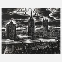Blick ?ber eine Stadtlandschaft mit hohen T?rmen unter bew?lktem Nachthimmel, Holzschnitt, unter der Darstellung handsigniert und datiert ?Frans Masereel 1962g, und betitelt ?Tours de Gand vues du Post Hotelg und nummeriert 228/750, hinter Glas gerahmt. Darstellungsma? 31,6 x 39,8 cm. K?nstlerinfo: belg. Graphiker, Zeichner, Illustrator, Entwerfer und Maler (1889 Blankenberge bis 1972 Avignon), studierte kurzzeitig an der Kunstschule Gent bei Jaan Delvin, als Graphiker Sch?ler von Jules de Bruycker, 1909 in London, ab 1910 in Paris ans?ssig, 1910 Nordafrikareise, 1914?21 in Genf unter anderem f?r die Zeitschriften ?Demaing und ?La feuilleg t?tig, mit Ren? Arcos Begr?nder der ?Edition du Sablierg, ab 1921 in Paris, Sommeraufenthalte in Equihen bei Boulogne-sur-Mer, zeitweise auch als Bildhauer t?tig, 1940 Flucht ?ber Orl?ans nach Laussou, 1945 R?ckkehr nach Paris, ab 1947 Professor an der Schule f?r Kunst und Handwerk in Saarbr?cken, ab 1949 in Nizza ans?ssig, Gr?ndungsmitglied und erster Pr?sident der Internationalen Vereinigung der Holzschneider ?Xylong, vertreten in zahlreichen Sammlungen, Quelle: Thieme-Becker, Vollmer und Internet.