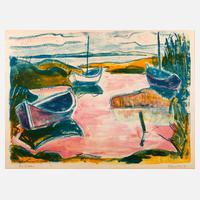am Strand liegende Boote in sommerlicher Boddenlandschaft unter locker bew?lktem Himmel, Farblithografie, Mitte 20. Jh., unter der Darstellung handsigniert ?Hippoldg und betitelt ?Am Boddeng, etwas stockfleckig, unter Passepartout, hinter Glas gerahmt, Darstellungsma? ca. 39,0 x 52,0 cm. K?nstlerinfo: dt. Maler und Grafiker (1909 Wilkau bei Zwickau bis 1972 Bad Gottleuba), Ausbildung zum Porzellanmaler, ab 1926 Studium an der Kunstgewerbeabteilung der Technischen Schule Zwickau, 1928?31 Besuch der Kunstgewerbeschule Dresden bei Carl Rade, ab 1931 Studium an der Akademie in Dresden bei Max Feldbauer und Ferdinand Dorsch, 1933 aus politischen Gr?nden Abbruch des Studiums und in Dresden freischaffend t?tig, 1936 Heirat mit Gussy Ahnert, ab 1945 freischaffend in Freiberg und Radebeul, Quellen: Thieme-Becker, Eisold ”K?nstler in der DDR”, Wikipedia.