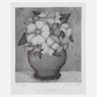 auf einem Tisch stehender Sommerblumenstrau?, Aquatintaradierung, unter der Darstellung handsigniert und datiert ?U. Bullmann (19)84g, nummeriert ?II 20/20g und betitelt ?Krug mit Bl?teng, hinter Glas gerahmt, Plattenma? ca. 15,5 x 13,5 cm. K?nstlerinfo: dt. Maler, Graphiker und Galerist (geboren 1945 in Zwickau), bis 1964 Lehre zum Maurer, 1964?68 Stud. zum Kunsterzieher und Geschichtslehrer an der Universit?t Leipzig, 1968?71 Kulturfunktion?r in Leipzig, 1971?76 Bezirkssekret?r des VBK der DDR in Karl-Marx-Stadt, anschlie?end freischaffend in Karl-Marx-Stadt (Chemnitz), 1997 Gr?ndung der ”Galerie Borssenanger” in Chemnitz, ab 2007 in Kooperation mit Ren? Marn, im November 2010 Galeriedependance in Hamburg-Blankenese, t?tig in Chemnitz, Quelle: Eisold ?K?nstler in der DDRg und Internet.