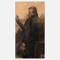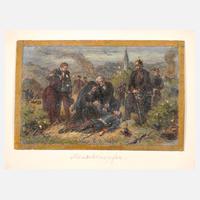 trauernde Eltern auf dem Schlachtfeld bei ihrem gefallenen Sohn, umgeben von Soldaten, im Hintergrund noch vereinzelt brennende Häuser, Mischtechnik auf Karton, unten in der Darstellung monogrammiert „C.S.“ rückseitig betitelt „Moderne Menschenopfer“ und Zuschreibung „Cajetan Schweitzer“, auf Unterlagekarton montiert, Darstellungsgröße ca. 8,3 x 13,0 cm. Künstlerinfo: dt. Historienmaler (1844 München bis 1913 München), ab 1861 Studium an der Münchner Akademie bei Friedrich Voltz, Wilhelm von Kaulbach und Moritz von Schwind, tätig in München, Quelle: Thieme-Becker und Matrikel der Münchner Akademie.
