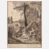 Kinder hinter einem Verhau, beim Fangen von Vögeln mittels Netz, in waldreicher Landschaft, Tuschepinsel und Feder, Mitte 19. Jh., unter der Darstellung rechts teils unleserlich signiert „Louis Guil... Schafer“ und beschriftet „Ein Vogel wird gar leicht auf solche Art gefangen, weil ihm so Tag als Nacht wird listig nachgestellt: durch ist manch ... Schnepf von selbst ins Garn gangen...“, geringe Erhaltungsmängel, hinter Glas gerahmt, Blattmaß ca. 38,5 x 29,8 cm.