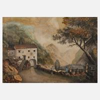 Blick auf ein Zollhaus in gebirgiger Landschaft, mit üppiger Vegetation und Figurenstaffage, Mischtechnik über Tusche, Mitte 19. Jh., Erhaltungsmängel, unter Passepartout, hinter Glas gerahmt, Passepartoutausschnitt ca. 36,8 x 51,5 cm.