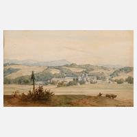 spätsommerlicher Blick von einer Anhöhe mit Marterl, vorbei an Bauern mit Ochsenkarren, zur Klosteranlage vor sanft bewegter Bergkulisse, fein erfasste, poesievolle Landschaftszeichnung, Mischtechnik (Aquarell über Bleistift), rechts unten in Tusche teils undeutlich signiert und datiert ”Ch. v. Eichthal den 20. S.... (18)72”, gering gebräunt und gelblichen, , hinter Glas und Passepartout gerahmt, Passepartoutausschnitt ca. 22,5 x 38,5 cm.