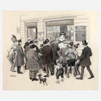 Menschenmenge vor einem Schaufenster, eine junge Frau beim Kauf von Zigaretten beobachtend, Mischtechnik, 1911, links unten signiert „v. Meissl“, auf Rahmenrückseite bezeichnet „Fliegende Blätter, Nr. 3433, 15. April 1911 465 x 395“, Zeichnung als Illustrationsvorlage, unter Passepartout, hinter Glas gerahmt, Passepartoutausschnitt ca. 35,0 x 42,0 cm. Künstlerinfo: auch Agost Ritter von Meissl, ungarisch-dt. Soldaten- und Tiermaler, Illustrator (1867 Bösing bis 1926), Studium an der Akademie in Budapest und ab 1889 an der Akademie in München, Quellen: Thieme-Becker, Internet.