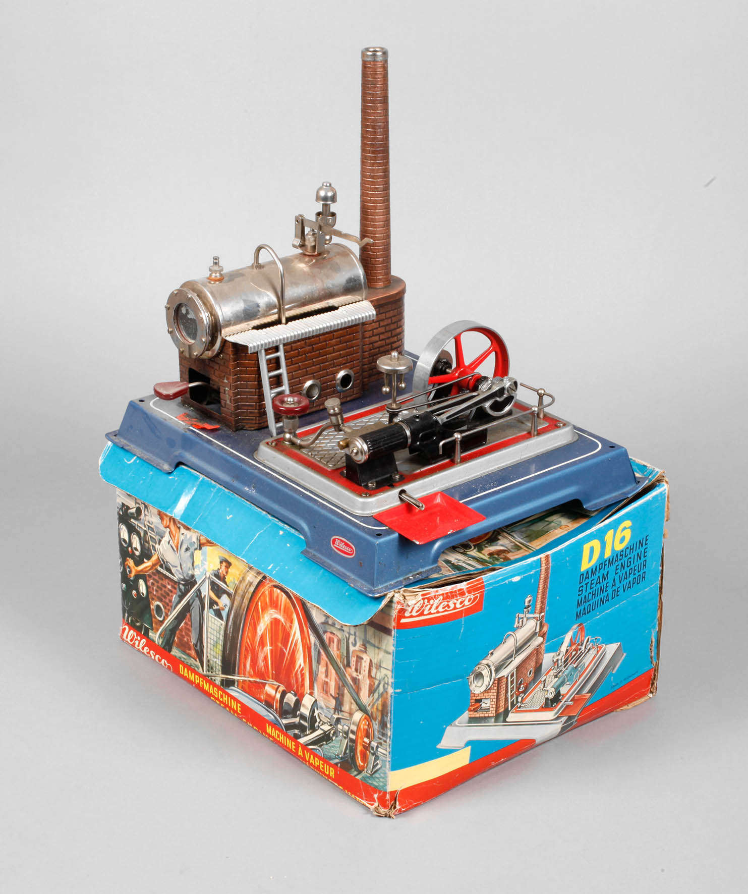 Herst. Wilh. Schröder & Co., datiert 1973, gemarkt mit Zusatz Made in Western Germany, Blech und Guss farbig gefasst, blanke Teile vernickelt, kupferfarbener Rechaud und Schlot in Backsteinprägung, liegender Kessel mit Gewichtssicherheitsventil, Dampfpfeife, Wasserstandsglas, Brennschieber, Leiter, feststehendem Zylinder mit Schwungrad, imitiertem Zentrifugalregulator und Kondenswasserschale, auf Sockel montiert, mit orig. Zubehör, darunter Trichter, Zylinderöl, Schlüssel, Trockenbrennstoff Esbit, Gebrauchsanweisung, Lieferschein und Prospekt, in orig. Karton (min. lädiert), bespielter Zustand, Fkt. nicht geprüft, H ges. 27 cm, Fundament 30,5 x 25 cm, Kessel D 5,5 x L 14 cm.