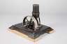 für Bastler, Modell 4171, 1920er Jahre, ungemarkt, Guss geschwärzt bzw. blanke Teile vernickelt, nicht kompletter Zustand, Fundament ergänzt, H ohne Fundament 16 cm, D Schwungrad 12 cm, Sockel max. 27 x 22 cm.