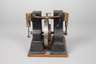 Mitte 20. Jh., ungemarkt, Messing und Guss, teils orig. geschwärzt bzw. vernickelt, mit zwei oszillierenden Zylindern, mittigem Schwungrad und Absperrhahn, auf Holzplatte montiert, funktionstüchtig, Altersspuren, H ges. 22 cm, Sockel 27 x 20,5 cm.