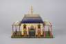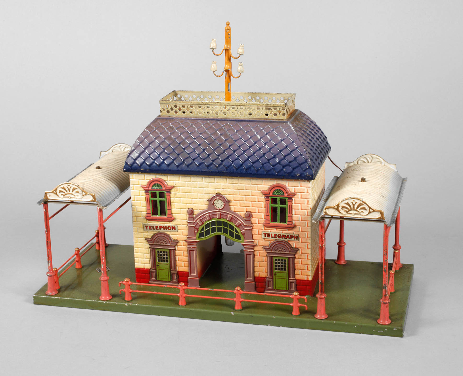 Modell 10/618, um 1910/20, gemarkt mittels Plakette, Weißblech geprägt, farbig handlackiert und partiell lithogr., Spur 0, zweigeschossiges Gebäude in Ziegelsteinoptik mit durchbrochen gearbeiteten, verblendeten und mit Celluloid hinterlegten Fenstern, Mitteldurchgang, abnehmbarem Schindeldach, Dachgitter und Isolatorenmast, seitlich je eine Bahnsteighalle mit Wellblechdach, auf Sockel mit Geländern montiert, für Kerzenbeleuchtung, bespielter, nachträgl. elektr. Zustand mit min. Altersspuren, Maße max. 38 x 16 x 30 cm.