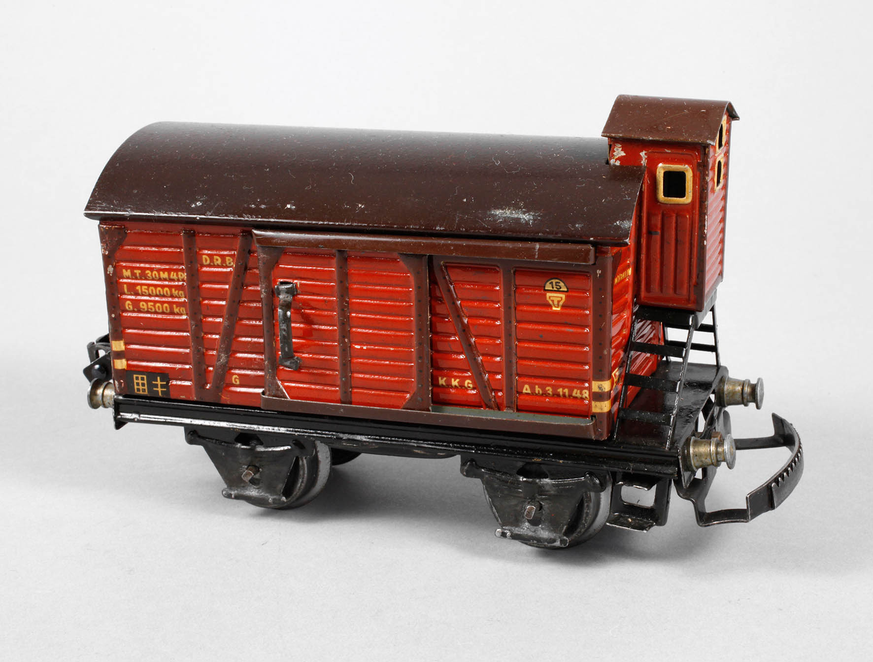 Modell 1691, um 1935, gemarkt, Blech chromolithogr., braun, zweiachsig, Spur 0, mit hochstehendem Bremserhaus und einer Schiebetür, bespielter Zustand, eine Kupplung ergänzt, L 14,5 cm.