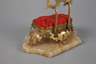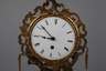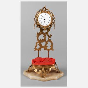 Mitte 19. Jh., Messingblech vergoldet, feine florale Gravur, hoher, durchbrochener Ständer auf Onyxsockel mit rotem Samtkissen, seitlich zwei Haken für weitere Taschenuhren, Spindeltaschenuhrenwerk, mit makellosem Emailziffernblatt, reinigungsbedürftig, H 25 cm.