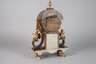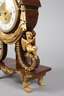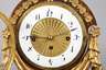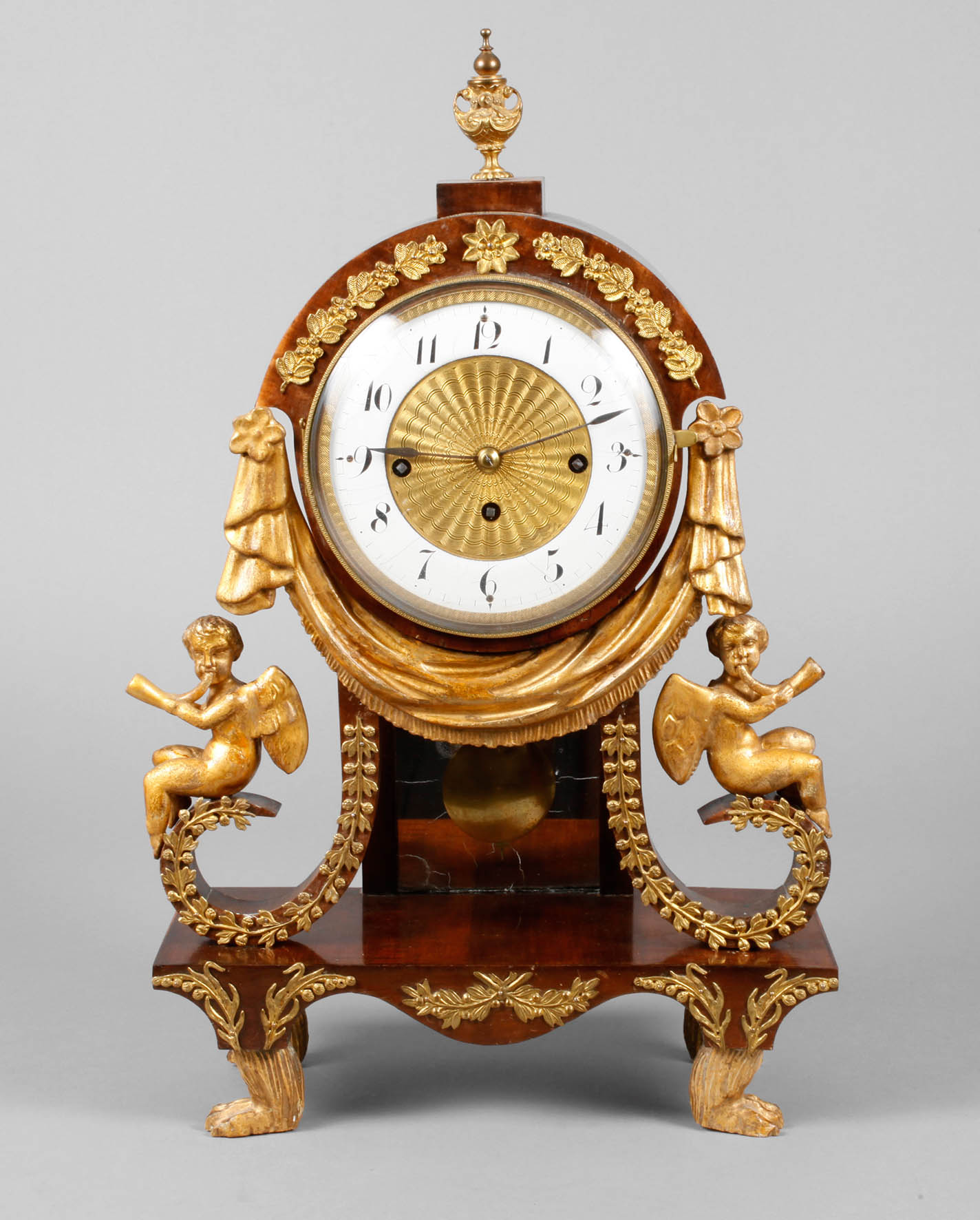 ungemarkt, wohl Wien, um 1810, furniertes Holzgehäuse mit fein geschnitzten und vergoldeten Figuren und Feston sowie vergoldeten Messingapplikationen, emaillierter Ziffernring mit Haarrissen, die Mitte vergoldet und fein guillochiert, Pendulenwerk mit drei Aufzügen, Viertelstundenschlag ”Grande Sonnerie” auf zwei Tonspiralen, Werk läuft, Maße 49 x 30 x 12 cm.