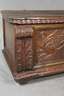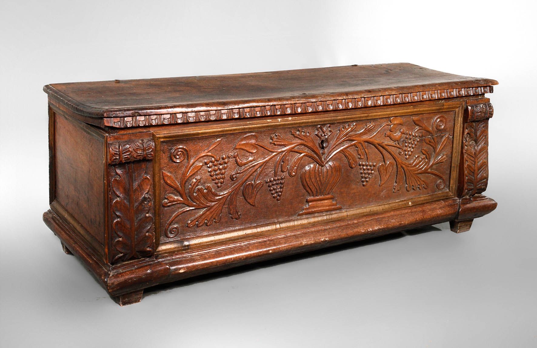 Italien, 17. Jh., Nussbaum massiv, reich geschnitzte Front mit Floralmotiven, die breiten Pilaster mit geschnitztem Akanthusblatt verziert, glatter Deckel mit Ornamentfries, original Schloss und Schlüssel, innen mit Beilade, schöne Alterspatina, H 58 x B 157 x B 53 cm.