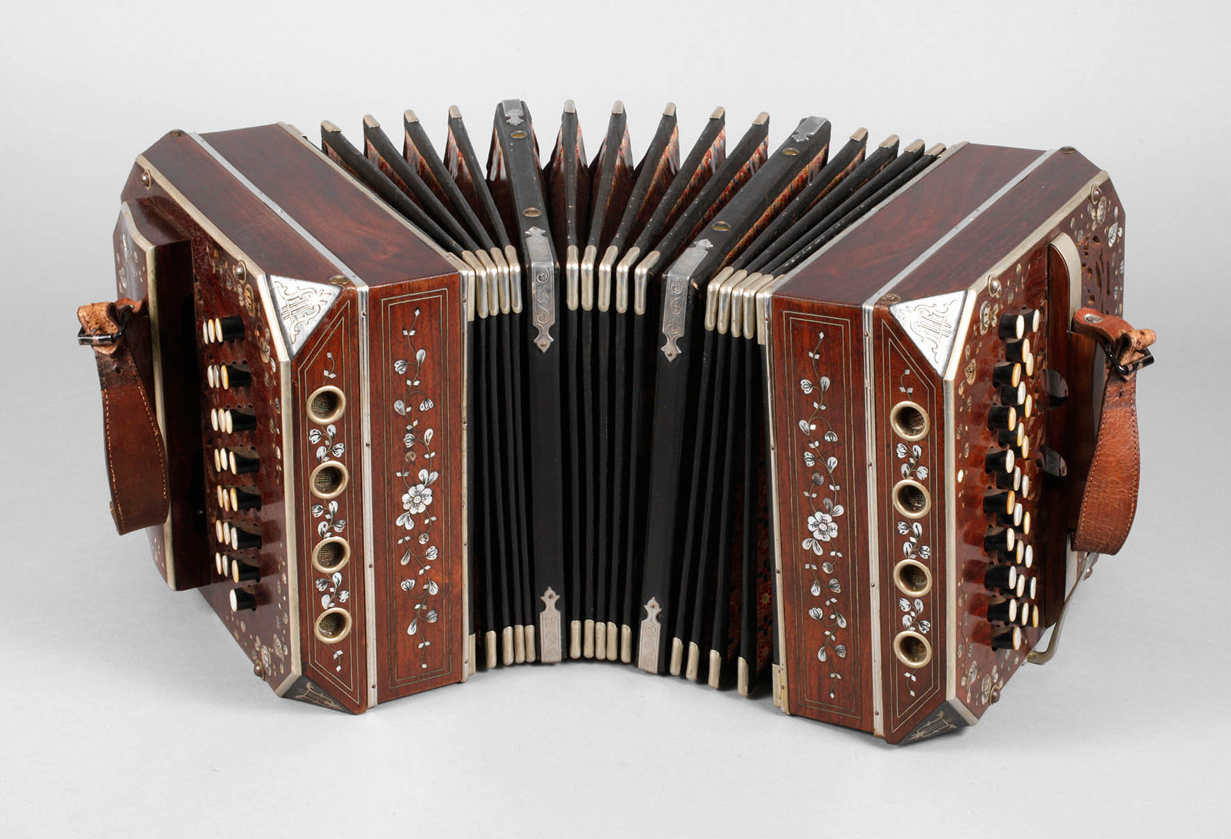 um 1920, gemarkt. C. Osw. Lenk, Zwickau i. Sa., palisanderfurniertes Gehäuse mit Ziereinlagen aus Perlmutt, vernickelte Metallteile, papierbespannter Blasebalg intakt, funktionstüchtig, gute Erhaltung mit leichten Gebrauchsspuren, L 40 cm.
