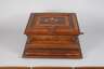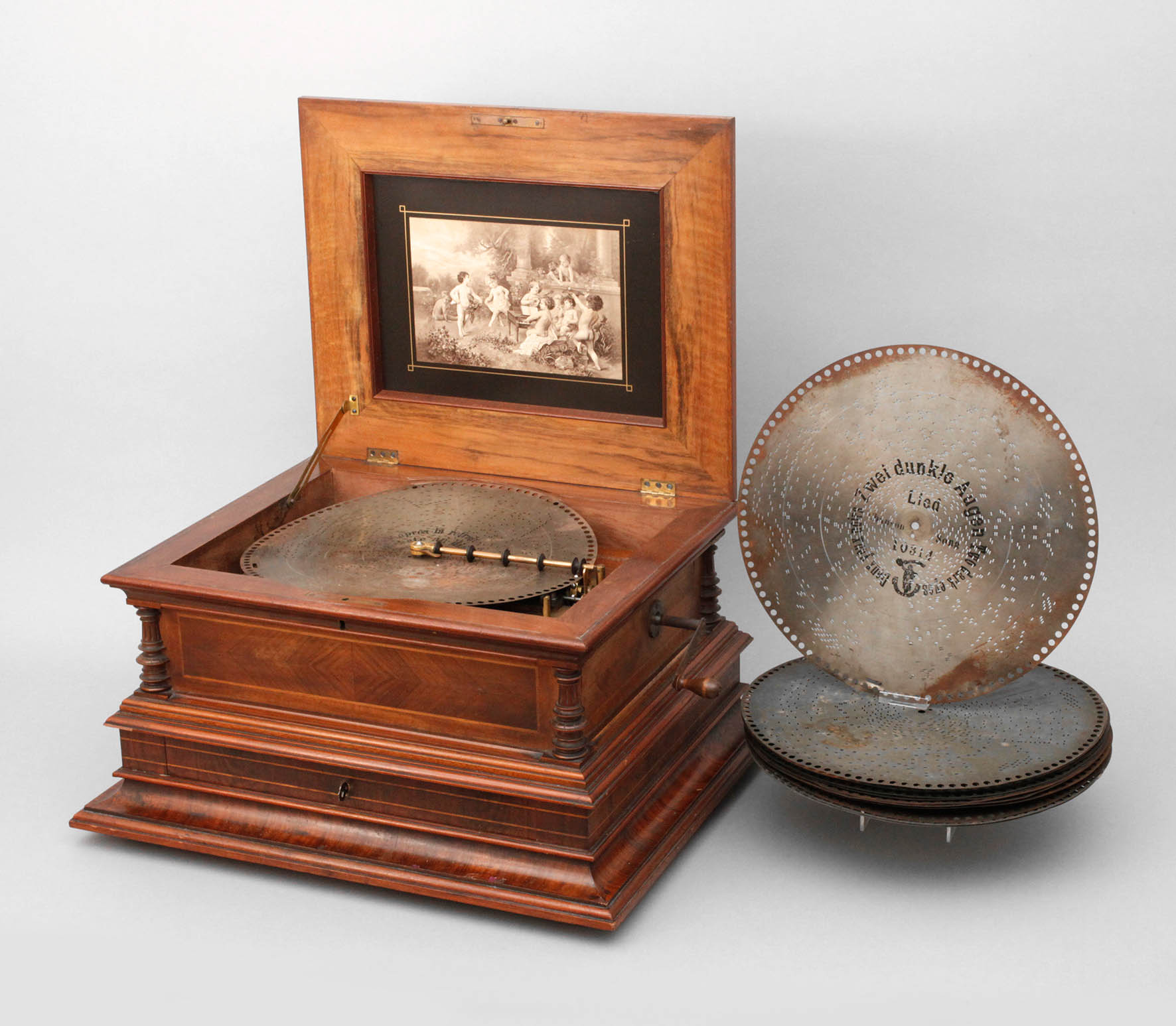um 1890, prächtiges Gehäuse in Nussbaum und Nussbaumwurzel furniert, Deckel floral intarsiert, Deckelinnenseite mit possierlicher Lithographie, Werk num. 28252, Doppelstimmkamm mit Zinnfraß, Werk läuft, Gehäuse mit kleineren Furnierfehlstellen, Maße 33 x 65 x 54 cm, beigegeben 15 Platten.