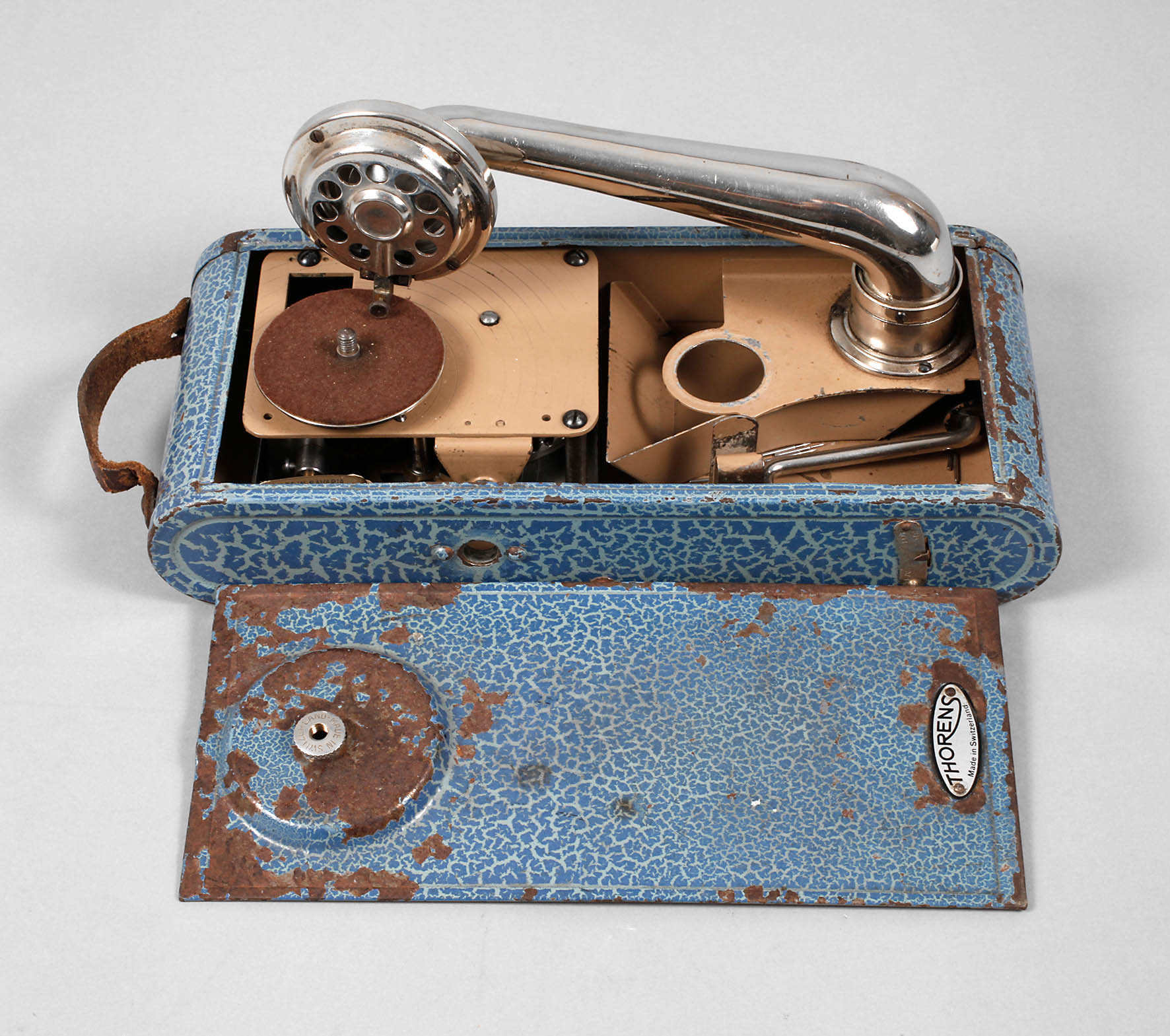 um 1930, auf Etikett gemarkt mit Zusatz Made in Switzerland, blau gefasstes Blechgehäuse, innen mit verchromtem Ausleger und Tonabnehmer, funktionstüchtig, Alters- und Gebrauchsspuren, Maße 28 x 12 cm.