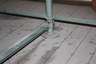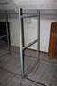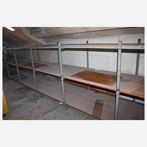 um 1920, stabiles Eisengestell mit Tellerfüßen, grau gestrichen, zwölf Einlegeböden aus Nadelholz, komplett zerlegt, normale Gebrauchsspuren, L ca. 830 cm x H 143 cm x B 98 cm.