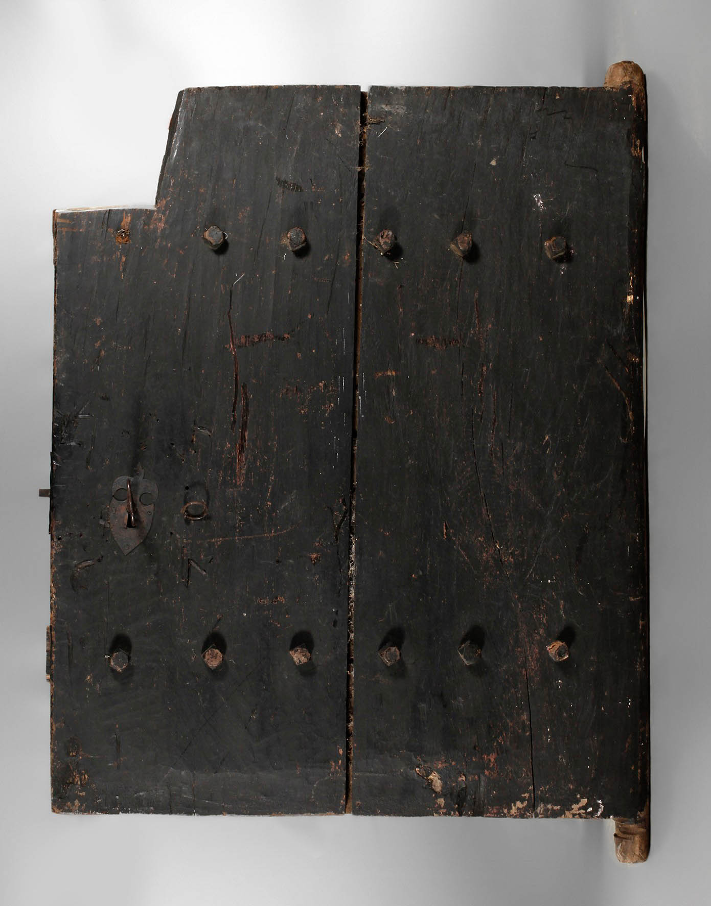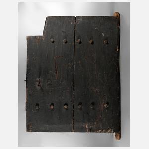wohl 17. Jh. oder früher, aus 7 Zentimeter starken Eichenbohlen gefertigtes Türblatt, die Riegel sichtbar mit Holznägeln befestigt, originales Kastenschloss und Schlüssel, eine Ecke mit Fehlstelle, Maße 158 x 117 cm.