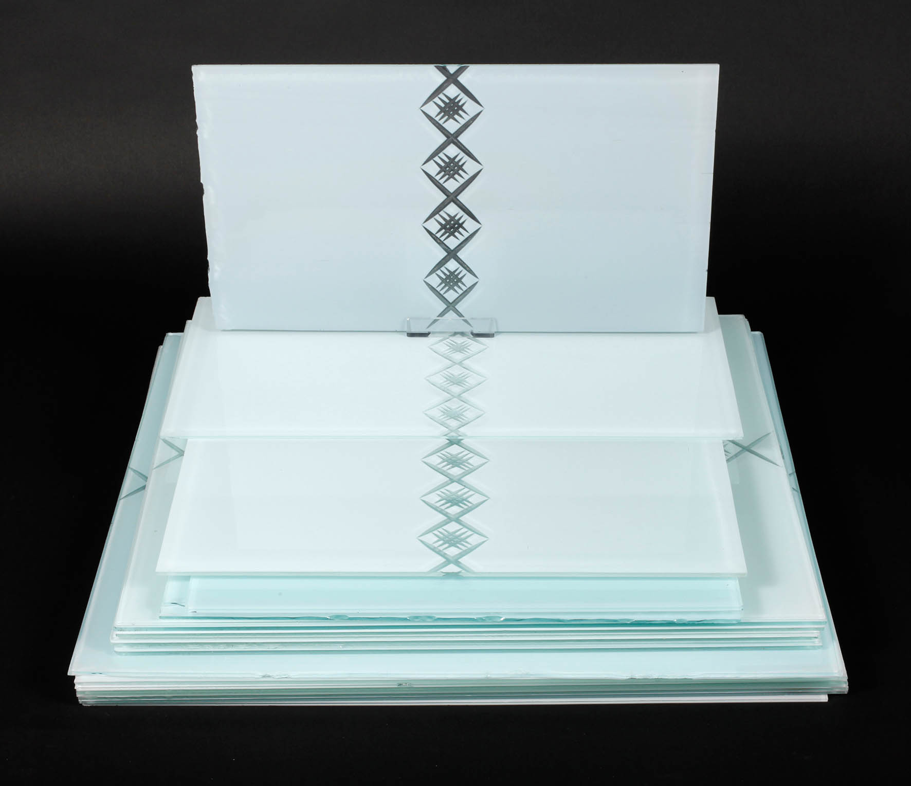 Restbestand einer Glaserei, um 1930, Klarglas mit weißem Überfang, mittig geschliffene Ornamentbordüre, insgesamt 21 Scheiben mit gleichem Dekor, Maße überwiegend 46 x 55 cm sowie einige kürzere Reststücke, insgesamt über 4 qm.