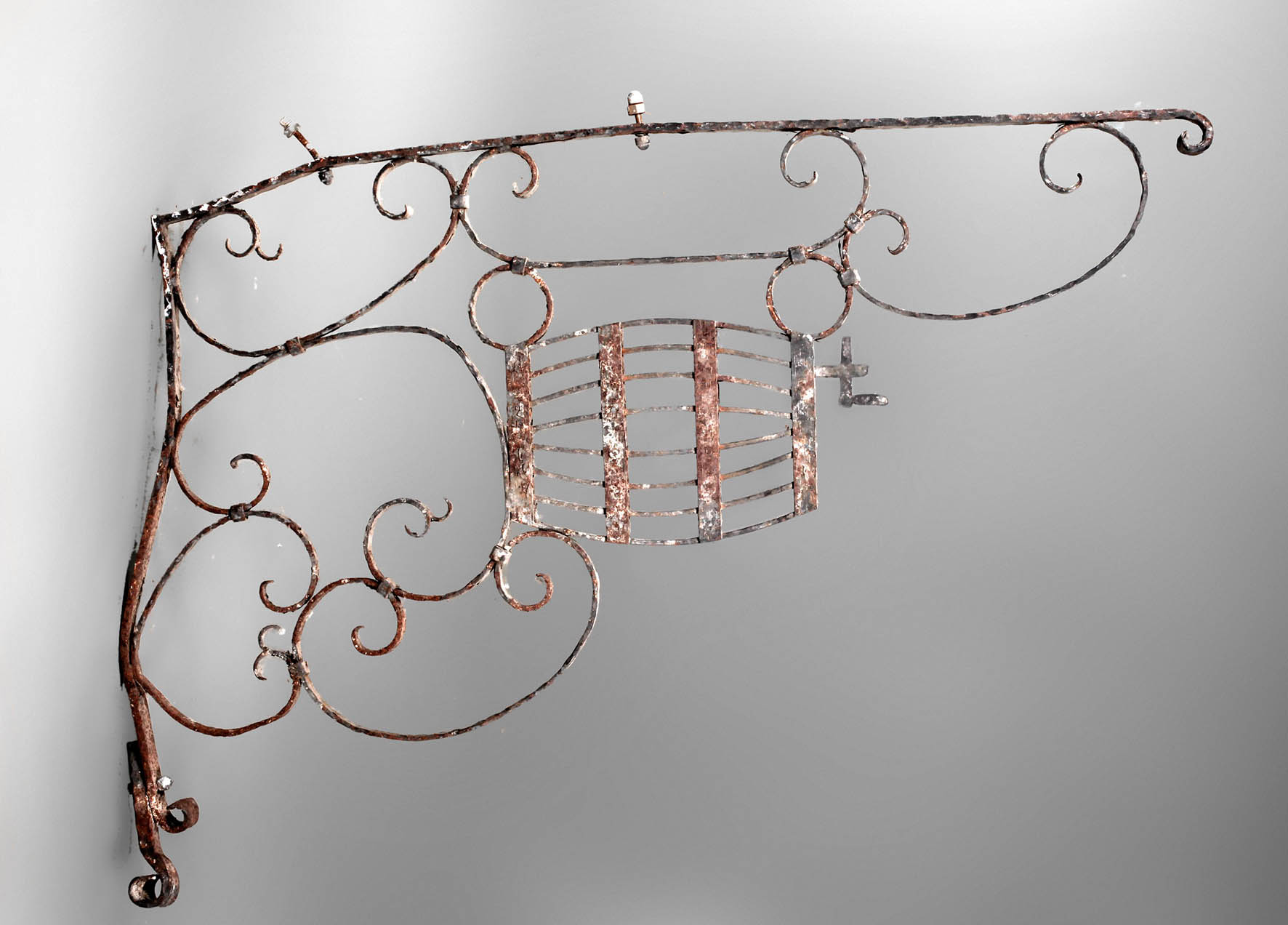 von einer Weinstube, um 1900, mit stilisiertem Weinfass, Reste grauer Farbfassung, Bergezustand mit Korrosionsspuren, H 90 x B 130 cm.