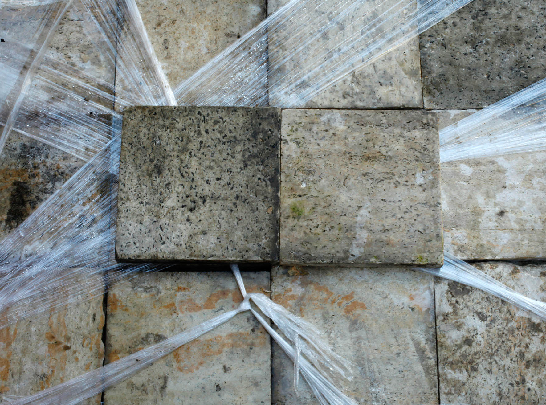 1930er Jahre, quadratische Platten aus 4 cm starkem Material, gesamt ca. 83 qm, Maße Platten je 30 x 30 cm, auf Paletten gestapelt.