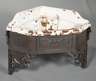 um 1880, Gusseisen, weiß emailliert, seitlich Seifenablage in Blattform, Oberfläche mit Emailabplatzern, H 30 x B 47 x T 47 cm.