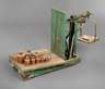 Anfang 20. Jh., Eisenguss und Holz, grün gefasst, Lastenwaage mit acht Gegengewichten, H 77 cm.