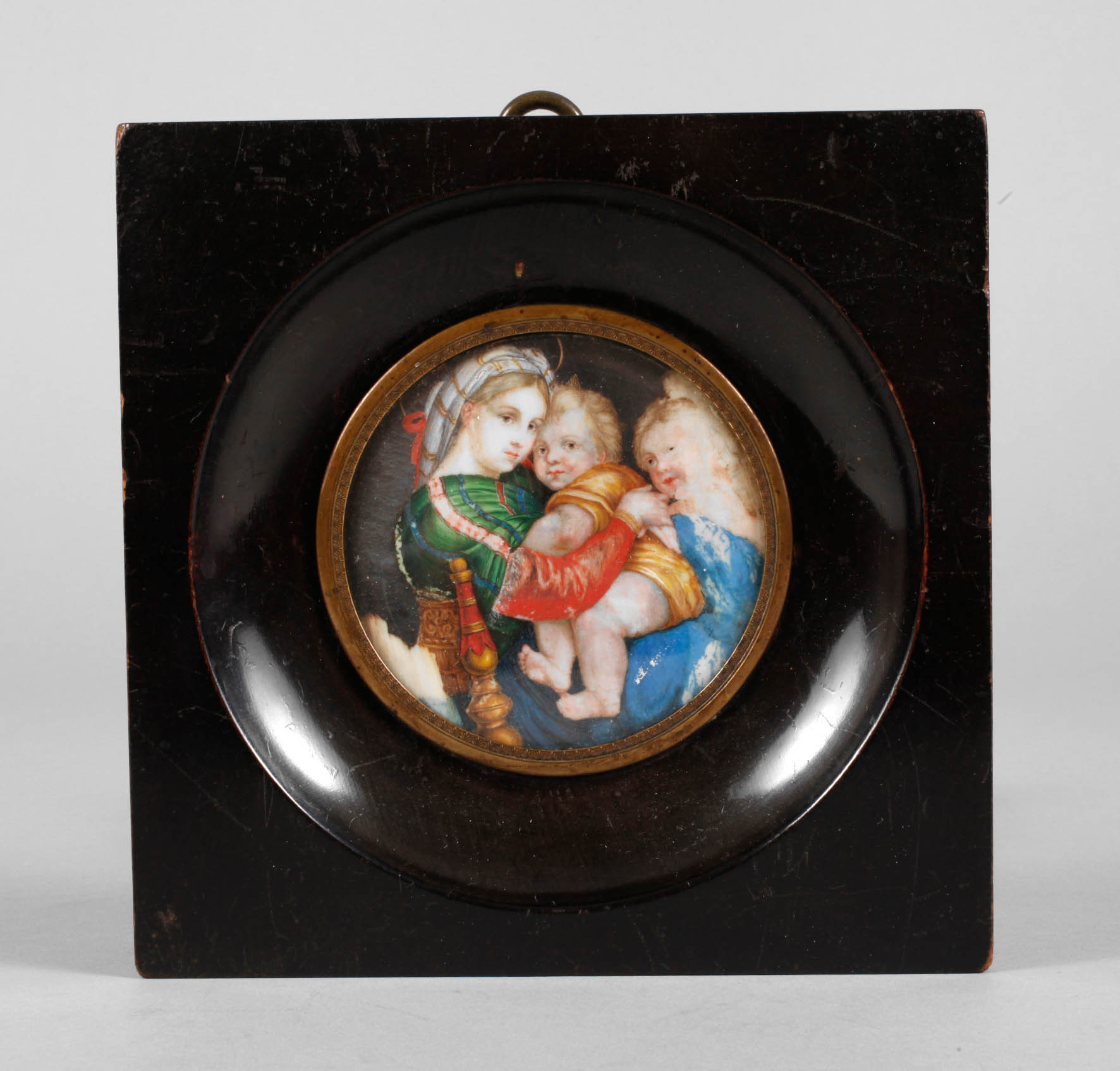 Ende 19. Jh., Gouache auf Elfenbein, verkleinerte Kopie nach dem berühmten Renaissancegemälde Madonna della Seggiola von Raffael von etwa 1514, hinter Glas im geschwärzten Rahmen gefasst, Farbverluste, rest.bed., D 9 cm.