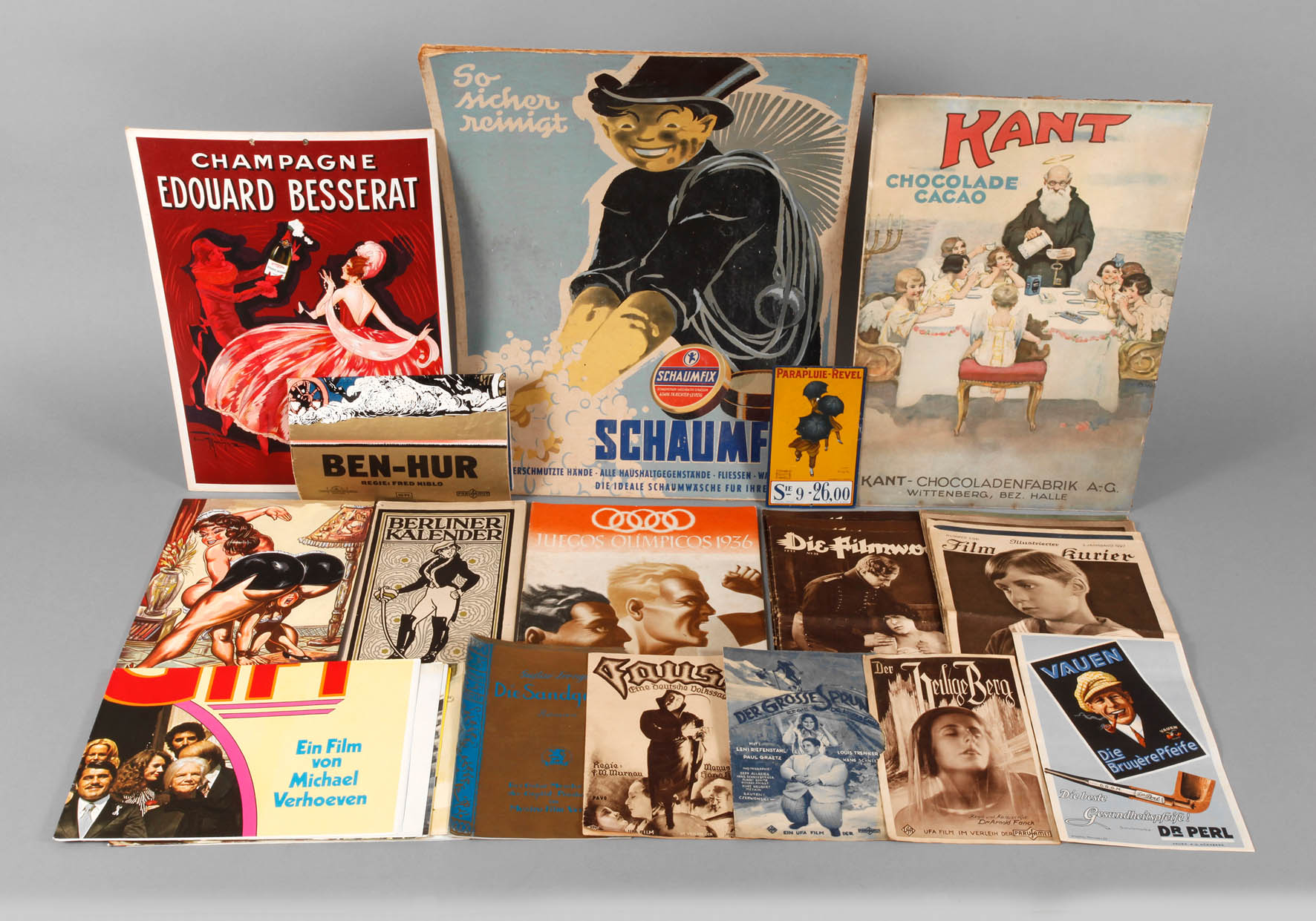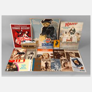 1. Hälfte 20. Jh., dabei Werbeschild Parabluie-Revel, Farblitho auf Blech, Werbeplakate Edouard Messerat, Kant-Schokolade, Schaumfix, Vauen Bruyère Pfeife, fünf Filmplakate und ein Werbeheft Ben Hur, Berliner Kalender 1911, neun Ausgaben des Filmkuriers bzw. der Filmwoche und einiges mehr, untersch. Maße und Erhaltungen.