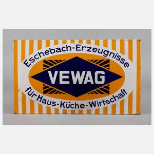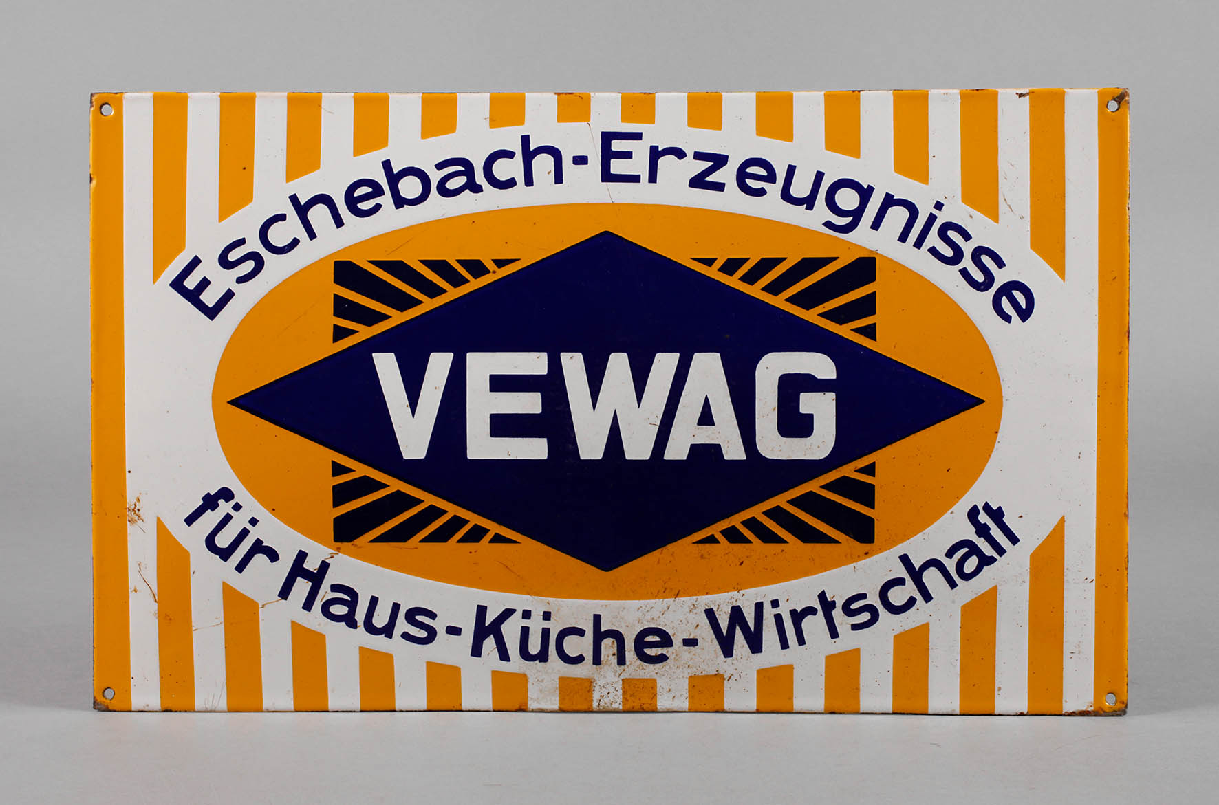 um 1930, ungemarkt, bezeichnet Eschebach-Erzeugnisse für Haus – Küche – Wirtschaft, langrechteckiges, leicht gebauchtes Schild, dreifarbig emailliert, vier orig. Bohrungen, Oberfläche mit leichten Erhaltungsmängeln, Z 2, Maße 49,5 x 30 cm.