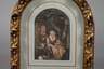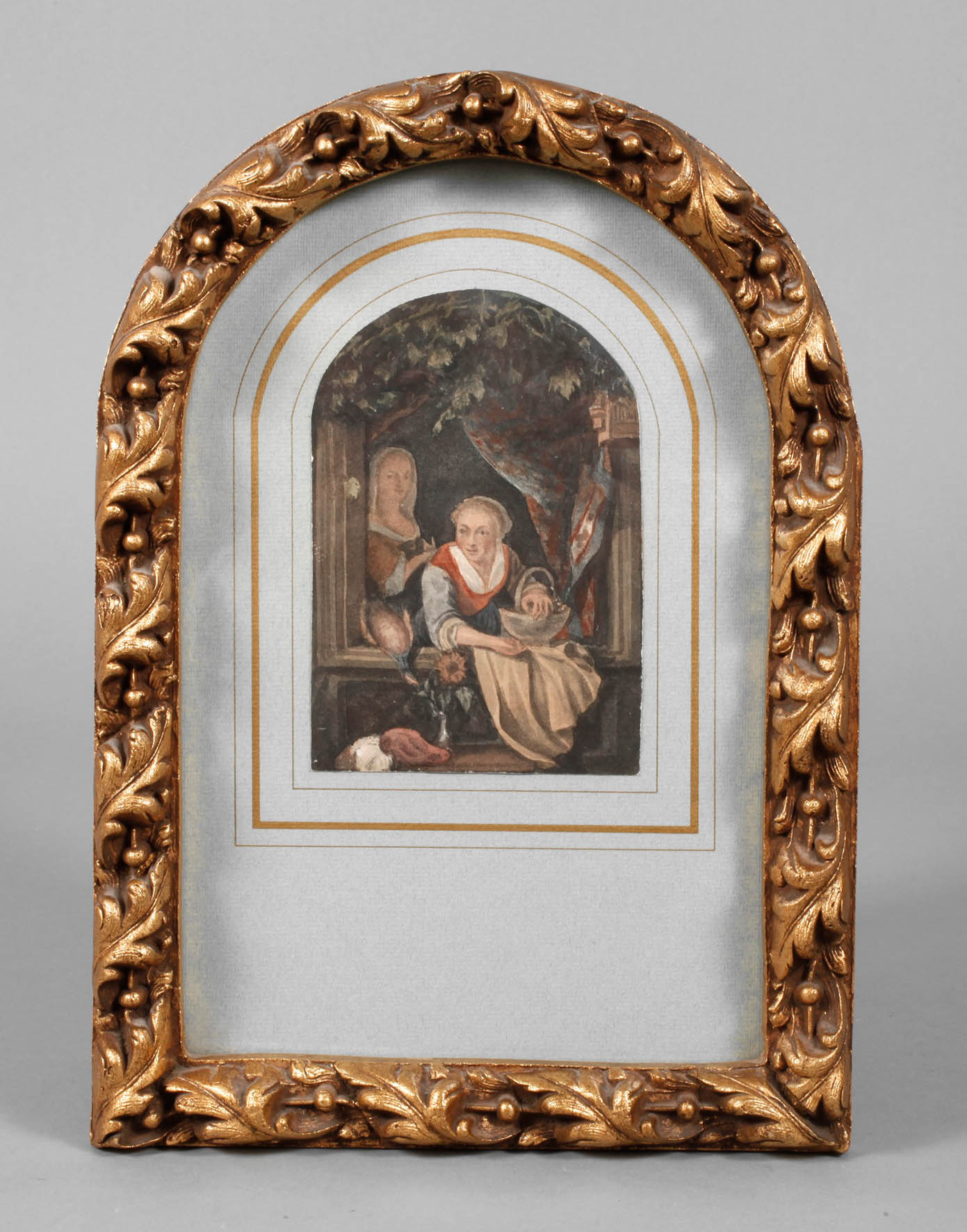 junge Frau mit Korb im hellen Licht der Sonne, an einem teils mit Efeu umwuchertem Fenster, im Hintergrund den Betrachter entgegenblickende weitere Magd, feintonige Malerei, Aquarell, um 1800, unsigniert, geringe Altersspuren, unter Glas in aufwendig gestuckten, bogenförmigen Rahmen gerahmt, Blattmaß ca. 14 x 9,5 cm, Falzmaß max. 22,7 x 18,3 cm.