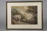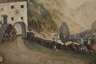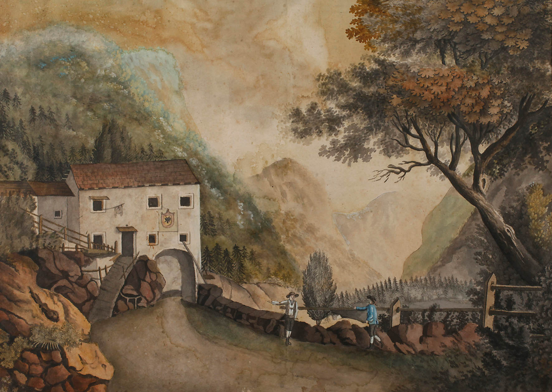 Blick auf ein Zollhaus in gebirgiger Landschaft, mit üppiger Vegetation und Figurenstaffage, Mischtechnik über Tusche, Mitte 19. Jh., Erhaltungsmängel, unter Passepartout, hinter Glas gerahmt, Passepartoutausschnitt ca. 36,8 x 51,5 cm.