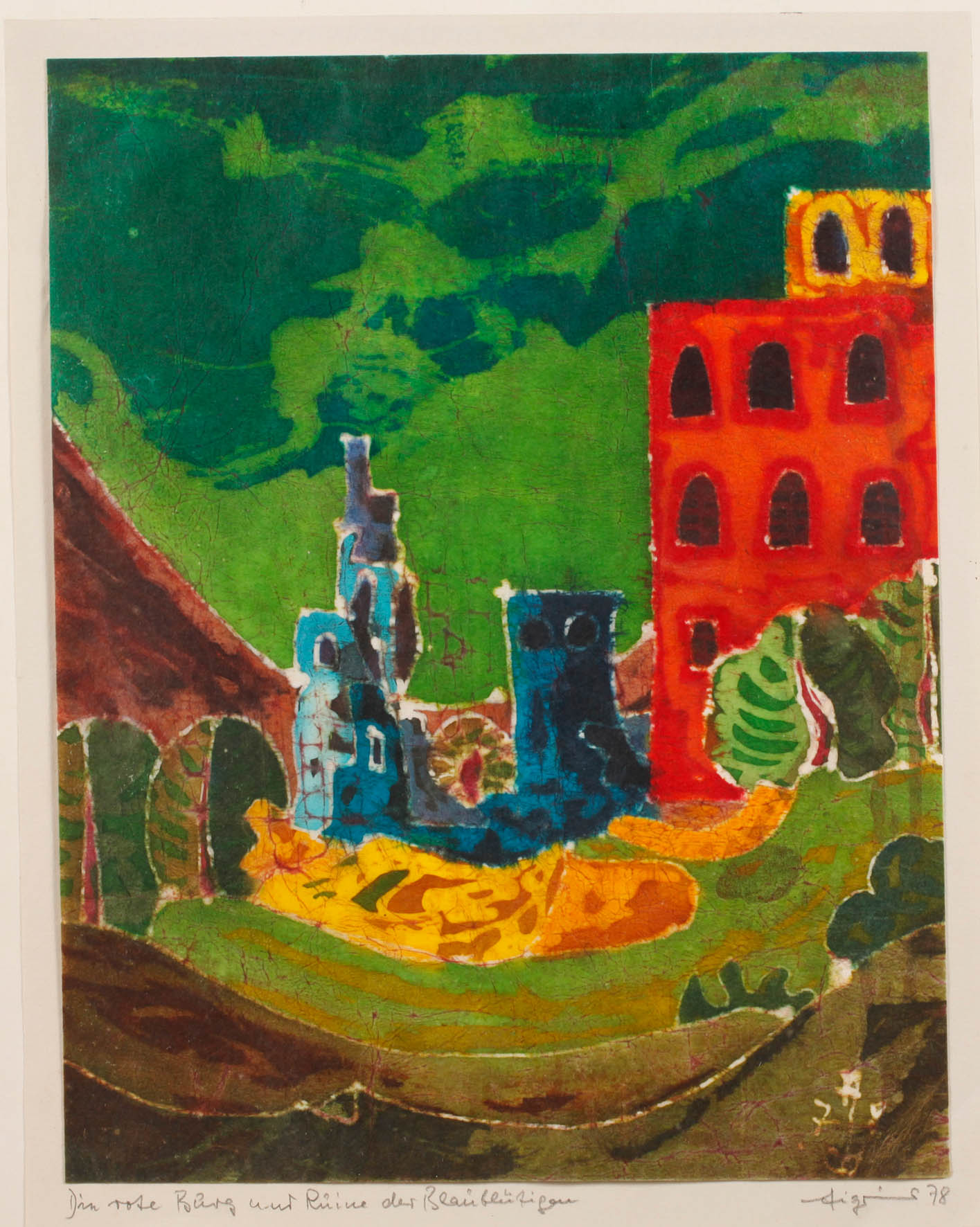 Burgruine neben großem neuen Haus in rot, umgeben von grüner, hügeliger Landschaft, Aquarell und Batik auf Japanpapier, auf Unterlagekarton handsigniert und datiert „Aigrinner (19)78“ und betitelt „Die rote Burg und Ruinen der Blaublütigen“, in Darstellung ligiertes Monogramm und Datierung „A. Ch (19)78“, zweimal auf Unterlagekarton montiert, hier etwas schmutzspurig, Blattmaß ca. 28,0 x 22,0 cm. Künstlerinfo: dt. Maler, Zeichner und Grafiker (1919 Hörreuth/Niederbayern bis 1983 Deggendorf), künstlerisch gefördert von Margarete Schneider-Reichel und Hermann Mayrhofer in Passau, blieb jedoch weitestgehend Autodidakt, Lehre zum Maurer und Bauzeichner, ab 1941 Bühnenmaler, 1954 Übersiedlung in die DDR, zunächst tätig als Gebrauchsgraphiker, lebte ab 1955 in Berga/Elster in Thüringen, arbeitete 1957–60 im Bauwesen, ab 1961 im Museum ”Satiricum” Greiz tätig, 1979–81 zeitweise Erblindung, verstarb während der Betreuung einer eigenen Ausstellung in Deggendorf, Quellen: AKL, Eisold ”Künstler in der DDR” und Wikipedia.