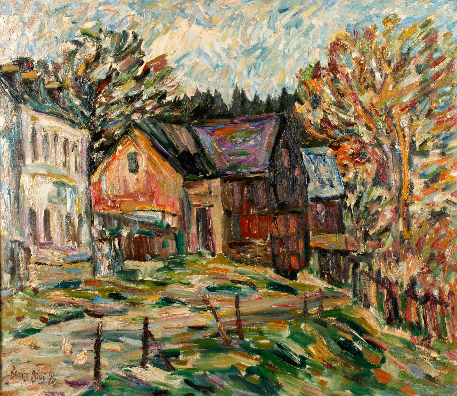 von hohen Bäumen umgebenes Bauernhaus mit Nebengelass unter sommerlichem, luftig bewölktem Himmel, kraftvolle, pastose Malerei, Öl auf Malplatte, links unten signiert und datiert „Fredo Bley (19)76“, gerahmt, Rahmen min. restaurierungsbedürftig, Falzmaß ca. 70 x 81 cm. Künstlerinfo: eigentlich Fredo Robert Bley, dt. Maler und Graphiker (1929 Mylau im Vogtland bis 2010 Reichenbach), 1943–46 Lithographenausbildung bei Carl Werner in Reichenbach, 1948–56 Lehre und Tätigkeit als Dekorations- und Schriftenmaler, Anregung durch den Maler Walter Löhner, weitestgehend Autodidakt, seit 1952 Mitglied des Verbandes Bildender Künstler (VBK) der DDR, 1957–64 als Ziegelei- und Baufacharbeiter tätig, ab 1966 freischaffend, beschickte zahlreiche Ausstellungen, unter anderem 2002 im neuen Bundeskanzleramt Berlin, tätig Mylau, später in Buchwald, Quelle: AKL, Eisold “Künstler in der DDR”, Frank Weiß ”Malerei im Vogtland” und Internet.