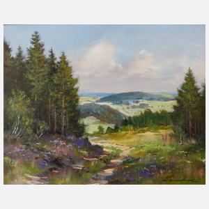 sommerlicher Blick von einer Anhöhe, zwischen Bäumen hindurch, in weite sonnige Vogtlandlandschaft, pastose Landschaftsmalerei, Öl auf Leinwand, um 1960, rechts unten signiert ”M. Feiler”, rückseitig auf der Leinwand betitelt ”Blick ins Vogtland” und Rahmungsetikett ”Bilder-Geyer ... Plauen”, schön gerahmt, Falzmaß 40 x 50 cm. Künstlerinfo: dt. Maler, Entwerfer und Illustrator (geboren 1925 in Plauen/Vogtland), 1939–43 Schüler der Plauener Kunstschule, gefördert von Kurt Geipel und Walter Löbering, tätig in Plauen, Quelle: Vollmer, Frank Weiß ”Malerei im Vogtland” und Internet.