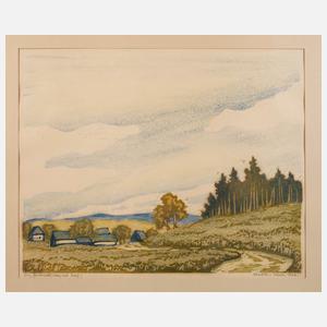durch Wiesen und Felder führender Weg auf ein Dorf in hügeliger Landschaft, unter hohem, luftig bewölktem Himmel, Farbholzschnitt, unter der Darstellung signiert und datiert „Mecke-Werda 1940“ und bezeichnet und datiert „Orig. Handdruck (Weg in Dorf)“, geringe Altersspuren, unter Passepartout, hinter Glas gerahmt, Darstellungsmaß ca. 32,0 x 40,5 cm. Künstlerinfo: eigentlich Clemens Mecke, dt. Landschaftsmaler und Graphiker (1892 Netzschkau bis 1974 Oggenhausen?), Ausbildung zum Lehrer und Kantor, künstlerische Ausbildung bei Hans Poller in Eibenstock und Walter Brand in Auerbach im Vogtland, 1920–45 als Lehrer, Schulleiter und Kantor in Werda im Vogtland, 1945 amerikanische Kriegsgefangenschaft, anschließend Übersiedlung nach Oggenhausen (Stadtteil von Heidenheim in Baden-Württemberg), hier 1950–57 als Lehrer tätig, Quelle: Vollmer und Internet.