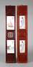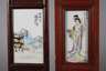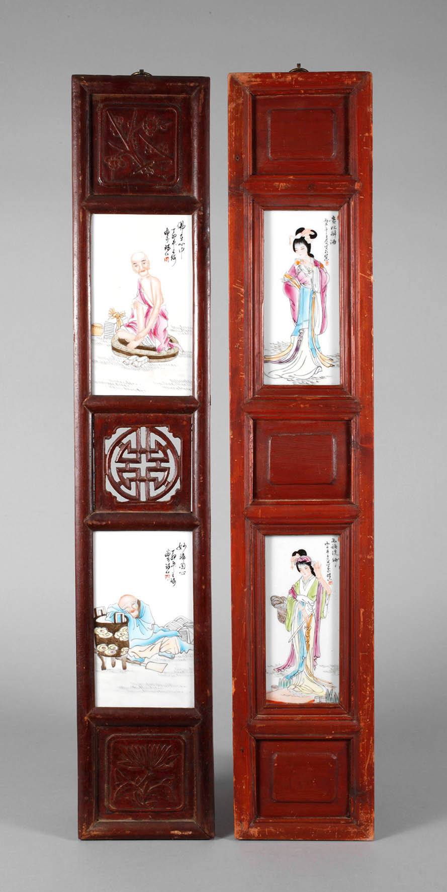 China, Anfang 20. Jh., hochrechteckige Tafeln aus braun lackiertem Tropenholz, partiell ornamental bzw. floral beschnitzt bzw. durchbrochen gearbeitet, mit jeweils zwei eingesetzten Porzellanbildplatten, diese signiert und in polychromer Aufglasurbemalung verziert, alle mit figürlichen Darstellungen im Interieur bzw. in Landschaft, Altersspuren, Maße je 92 x 16 cm.