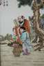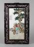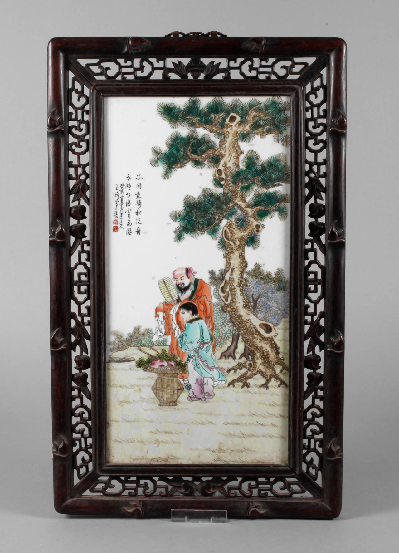 um 1920, signiert und gemarkt, Weißporzellan in polychromer Emailbemalung, figürliche Szene eines bärtigen Mannes und eines Knaben in Landschaft bei der Betrachtung eines Blumenbuketts, in beschnitztem und durchbrochen gearbeitetem Tropenholzrahmen, Altersspuren, IM 50 x 25 cm.