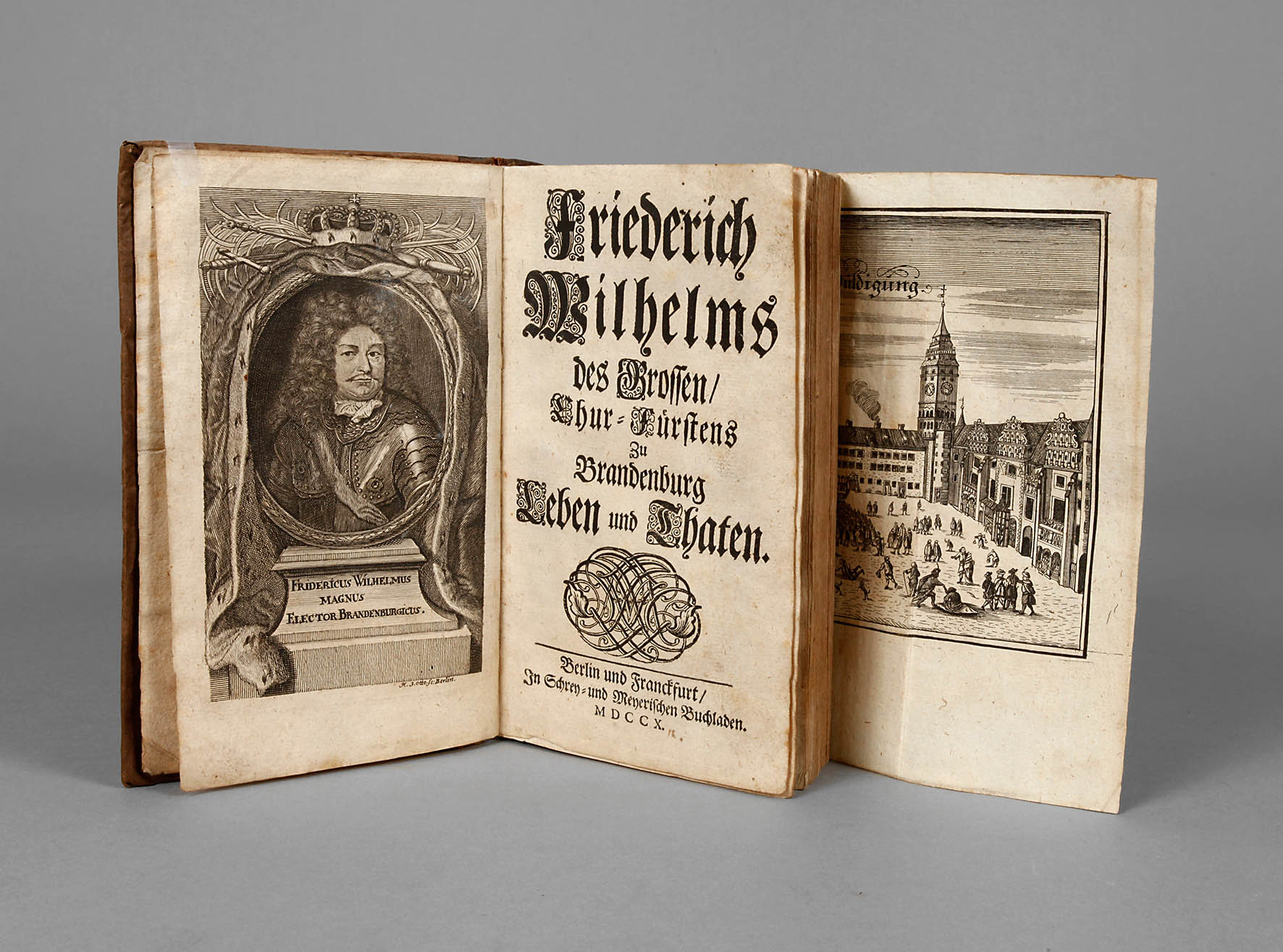 Friederich Wilhelms des Grossen/Chur-Fürstens zu Brandenburg Leben und Thaten (von Erdmann Uhse), im Schrey- und Meyerischen Buchladen, Berlin/Franckfurt 1710, Format Kl. 8°, 4 Blätter, 1256 S. und 15 Blätter, mit gestochenem Portrait-Frontispiz und vier gefalteten Kupfertafeln (Huldigung und drei Karten), im alt restauriertem Ledereinband der Zeit, gebräuntes Exemplar mit geplatztem Gelenk und lädiertem Einbandrücken in Kapitalnähe.