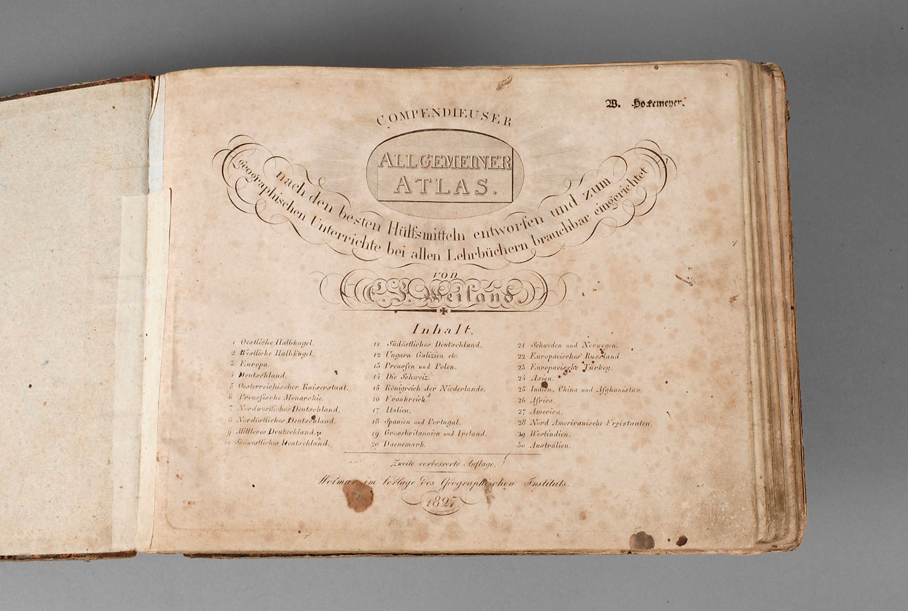 Allgemeiner Atlas der alten und der neuen Welt nach den besten Hülfsmitteln entworfen und zum geographischen Unterrichte bei allen Lehrbüchern brauchbar eingerichtet, von C.S. Weiland, 2. Auflage, Weimar, im Verlage des Geographischen Instituts, 1827, Querformat Gr. 8°, Titelblatt, mit 30 nummer. kolorierten Kupferstichkarten, im Halbledereinband der Zeit, Exemplar mit stärkeren Alters- und Gebrauchsspuren, eine Tafel mit verso verstärktem Einriss.