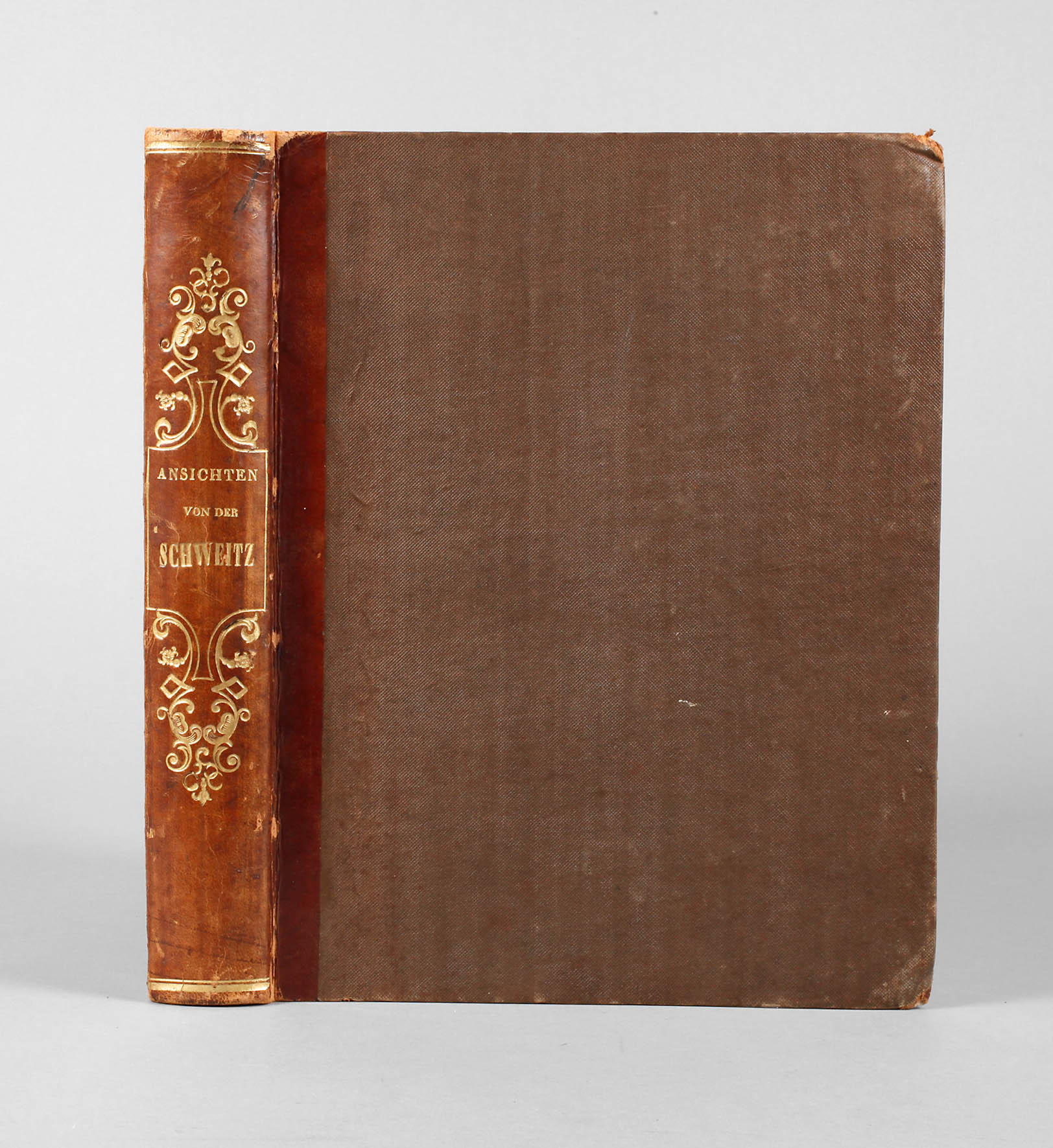 Switzerland, by William Beattie illustrated, in a series of views taken on the spot and expressly for this work, by W. H. Bartlett, Band 1 (von 2), Verlag Geo. Virtue, London 1839, Format Lex. 8°, 168 und 12 S. (dt. Text), Schmucktitel und 60 Tafeln mit Ansichten in Stahlstich, im Halbledereinband der Zeit mit dekorativer Rückengoldprägung, gebräuntes, partiell fleckiges Exemplar mit Exlibris Wilhelm Hunckel.