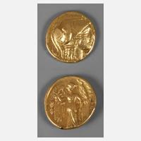 Stater, Alexander der Große III. (336–323 v. Chr.), Büste Athenas mit korinthischem Helm, Rv. stehende Nike mit Kranz und Stylis, Beizeichen Blitzbündel, rechter Rand mit Inschrift, D ca. 17 mm, G ca. 8,5 g, fvz.
