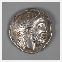 Amphipolis, Tetradrachme, AR, Philipp II. (359–336 v. Chr.), halbplastisches Haupt des Zeus nach rechts, Rv. Reiter mit Palmzweig, Blitzbündel und N, G ca. 14,3 g, fvz.