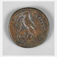 zwei Bronzemünzen, eine griechisch bezeichnet mit bekränzter Büste, Rv. stehende Göttin, D 19 mm, dazu wohl römische Münze mit bekränztem Herrscherhaupt (Caracalla?), Rv. stehender Adler mit gebreiteten Schwingen und nach rechts blickend, D 24 mm, sowie eine mit stehender Figur mit ausgebreiteten Armen und hebräisch? bezeichnet, Rv. mit Blütenmotiv, D 21 mm.