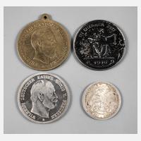 5 Mark 1875, Wilhelm I., ss, 2 Mark 1913, Völkerschlacht, ss+, dazu Bronzemedaille auf Friedrich III., Rv. Schriftrolle mit Motto sowie Lebensdaten, gehenkelt, fvz., Kriegsopfermedaille 1916 aus geschwärztem Eisen, Hosaeus, fvz.