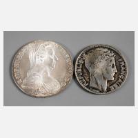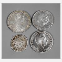 1/15 Taler 1686 RDR, Leopold, Taler Maria Theresia N.P., dazu 5 Corona 1900 und 5 Mark Preußen 1907.