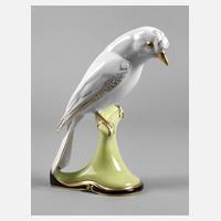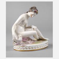 1920er Jahre, Pinselmarke Aelteste Volkstedter Porzellanmanufaktur, polychrom bemalt und vergoldet, nackte Venus mit blütengeschmücktem Haar, auf einem Sockel mit Tuch sitzend und eine Taube haltend, brandfleckig, H 13,5 cm.